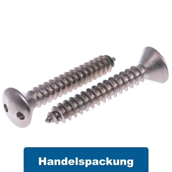 Diese Zweiloch-Schrauben mit Linsensenkkopf – auch bezeichnet als Linsensenkkopf-Sicherheitsschrauben, Zweiloch-Blechschrauben oder Anti-Vandalismus-Schrauben – bestehen aus rostfreiem Edelstahl A2 und sind mit einem selbstschneidenden Blechschraubengewinde ausgestattet. Der spezielle Zweilochantrieb schützt zuverlässig vor unbefugter Demontage, während der Linsensenkkopf einen nahezu flächenbündigen, optisch sauberen Abschluss ermöglicht.